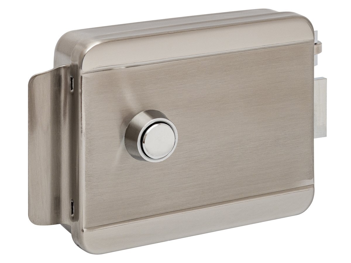 Электромеханический накладной замок, НЗ, универсальный, цилиндр снаружи, кнопка изнутри, 12 В, 3 А, -30...+50 °C, 120х102х35 мм, нержавеющая сталь
