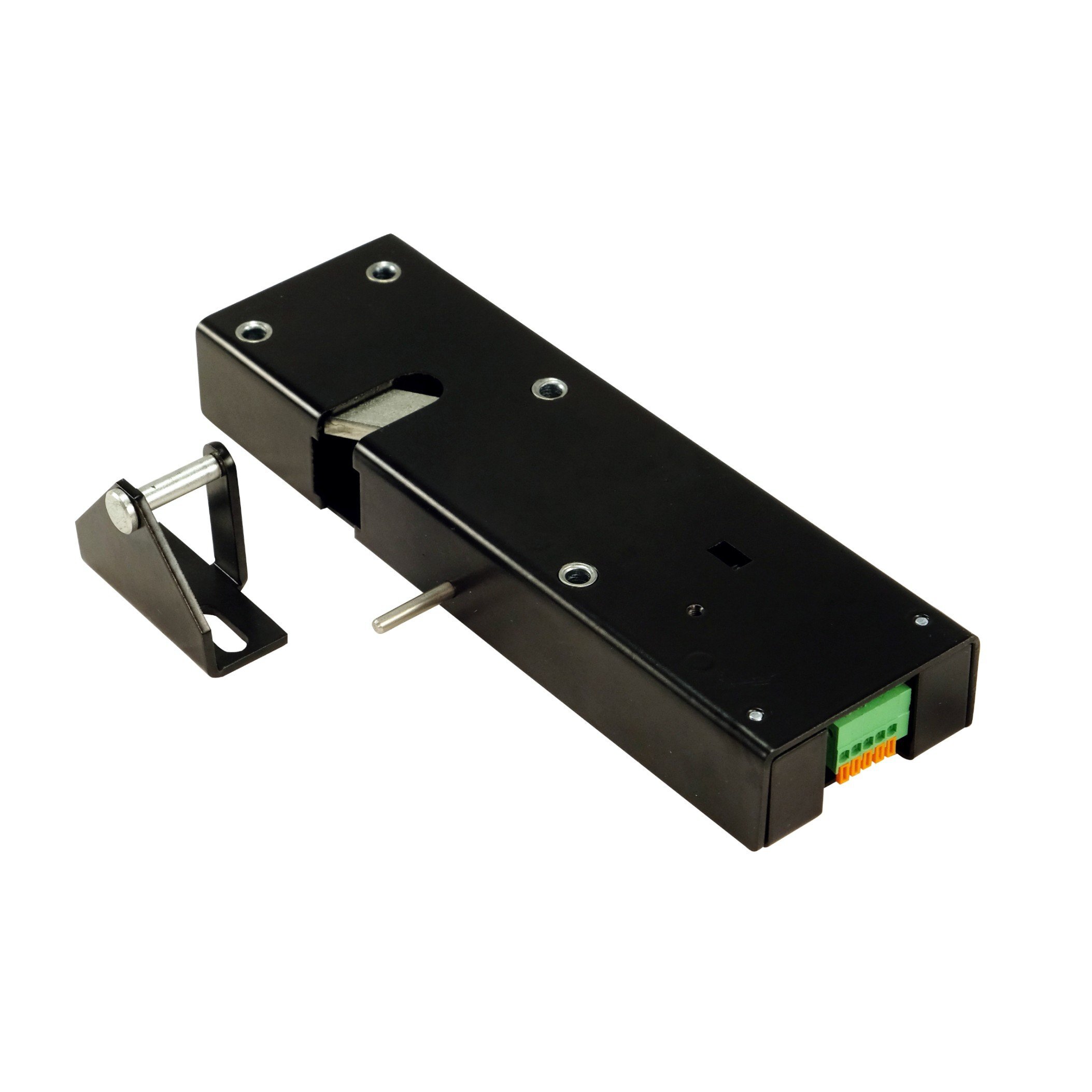 Электромеханический замок с толкателем и датчиком положения двери. Усилие удержания ригеля 500 кг. Нормально закрытый, напряжение питания 12В/0,4А, встроенный датчик состояния замка, замок устанавливается слева (петли двери справа), цвет - черный, 47х154х21 мм.
